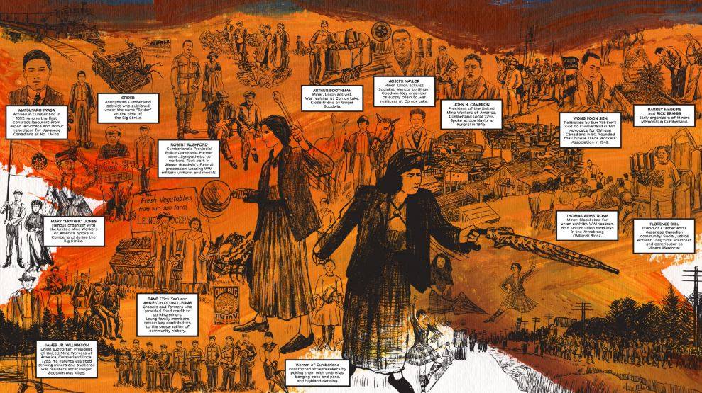 The Graphic History Collective, members Robin Folvik and Kara Sievewright and contributor David Lester, have all contributed to a new permanent display at the Cumberland Museum and Archives in Cumberland, BC. The exhibit spans over one hundred years of working and labour history through new interpretive panels, music, artwork, and illustrations. David created an original mural and the GHC contributed anĀ illustrated labour history timeline.