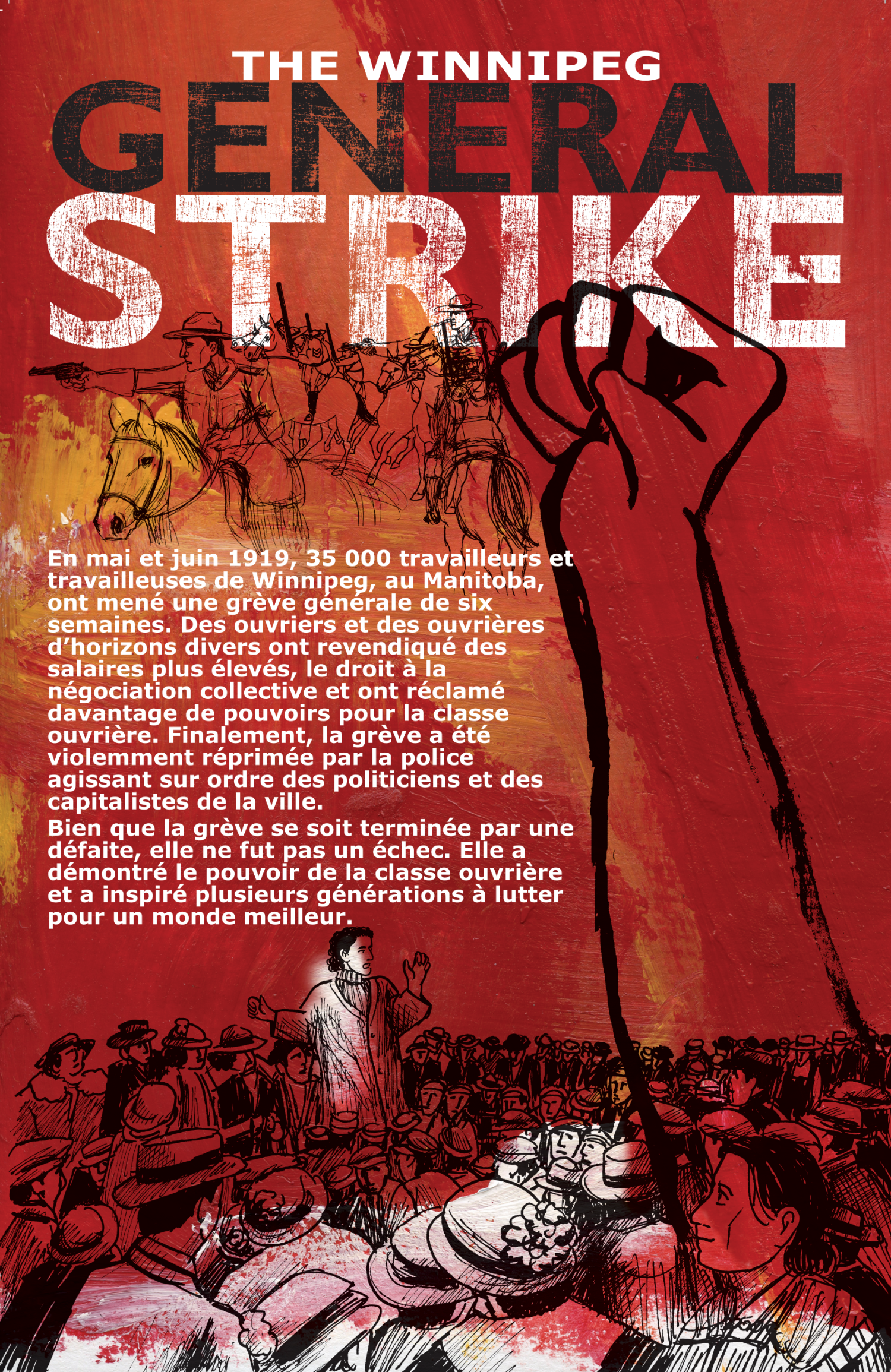 [Image Description: The top of this poster says The Winnipeg General Strike in large letters over a red and yellow painted background. Below this is a black line drawing of police on horses. A large fist rises up on the right. On the bottom a black and white line drawing of a crowd from 1919 watching a women speaking.
