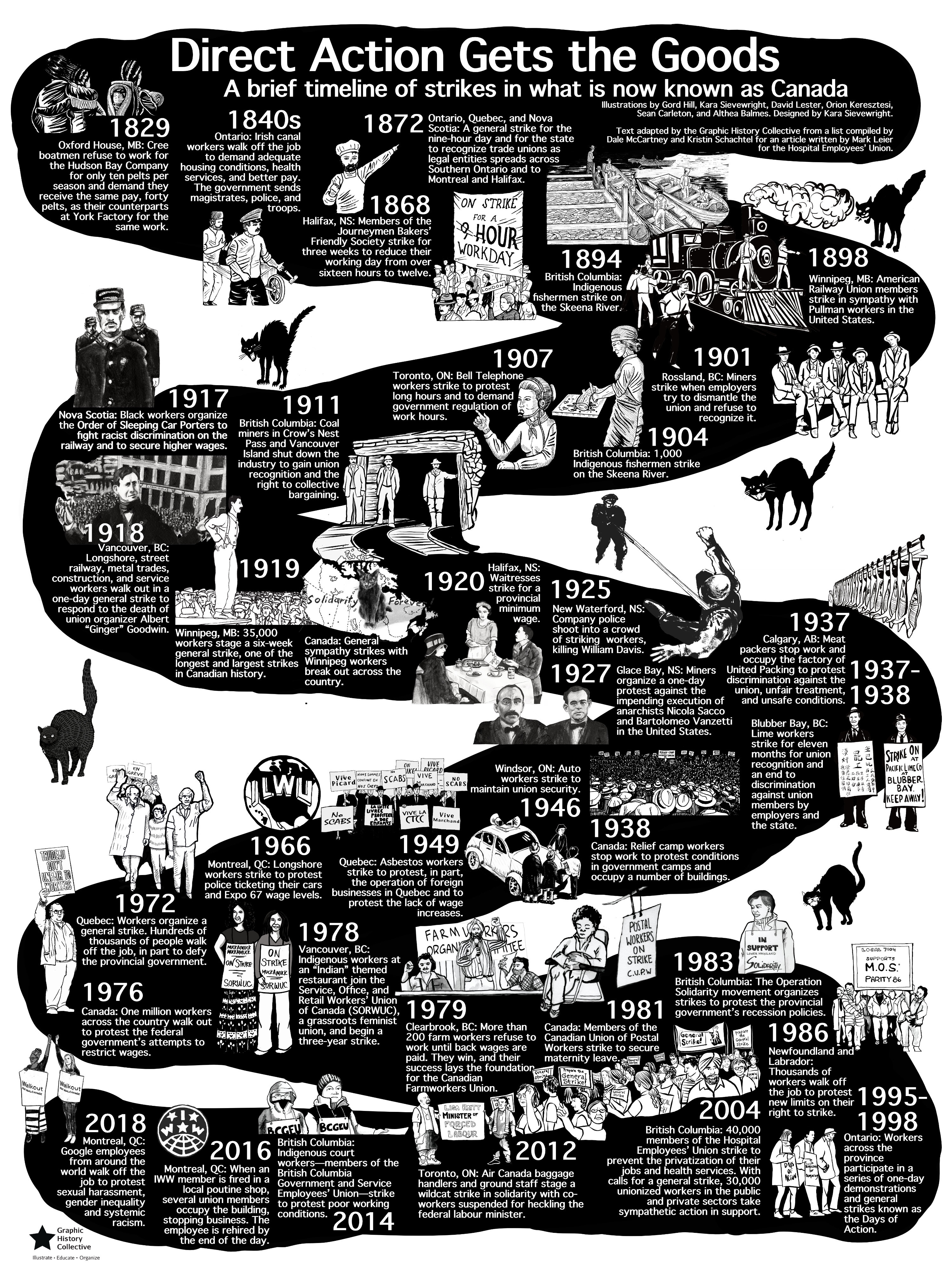 A text version of this timeline is in our book Direct Action Gets the Goods, as well as on the walls of the Cumberland Museum and Archives. The text was adapted by the Graphic History Collective from a list compiled by Dale McCartney and Kristin Schachtel for an article written by Mark Leier for the Hospital Employee's Union.