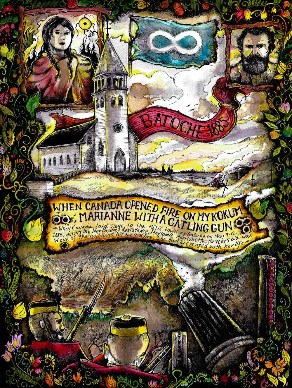 Resenting the fact that their land was sold without consultation, the Métis took up arms against Canada in 1869, under the leadership of Louis Riel. The Métis Resistance was successful, and after a series of negotiations, the Métis entered Confederation with Canada with the 1870 Manitoba Act, which created the province of Manitoba. At Batoche, Saskatchewan, during the Northwest Resistance of 1885, the Métis would again take up arms to defend their land against the ever-expanding nation-state of Canada. When Canada laid siege to the Métis town of Batoche on May 9-12, 1885, during the Northwest Resistance, Marianne Morrissett, 16 years old, was in one of the buildings hit by gun fire. She barely escaped with her life.