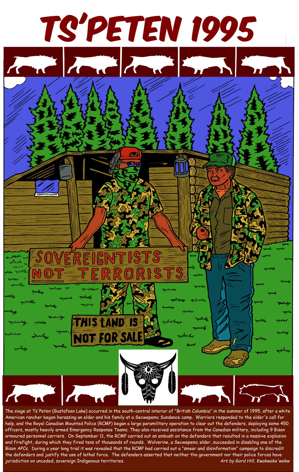 The siege of Ts’Peten (Gustafsen Lake) occurred in the south-central interior of “British Columbia” in the summer of 1995, after a white American ranger began harassing an Elder and his family at ta Secwepemc Sundance camp. Warriors responded to the Elder’s call for help, and the Royal Canadian Mounted Police (RCMP) began a large paramilitary operation to clear out the defenders, deploying some 450 officers, mostly heavily armed Emergency Response Teams. They also received assistance from the Canadian military. On September 11, the RCMP carried out an ambush on the defenders that resulted in a massive explosion and firefight, during which they fired tens of thousands of rounds. During a year long trial it was revealed that the RCMP had carried out a “smear and disinformation” campaign to discredit the defenders and justify the use of lethal force. The defenders asserted that neither the government nor the police forces have jurisdiction on unceded, sovereign Indigenous territories.