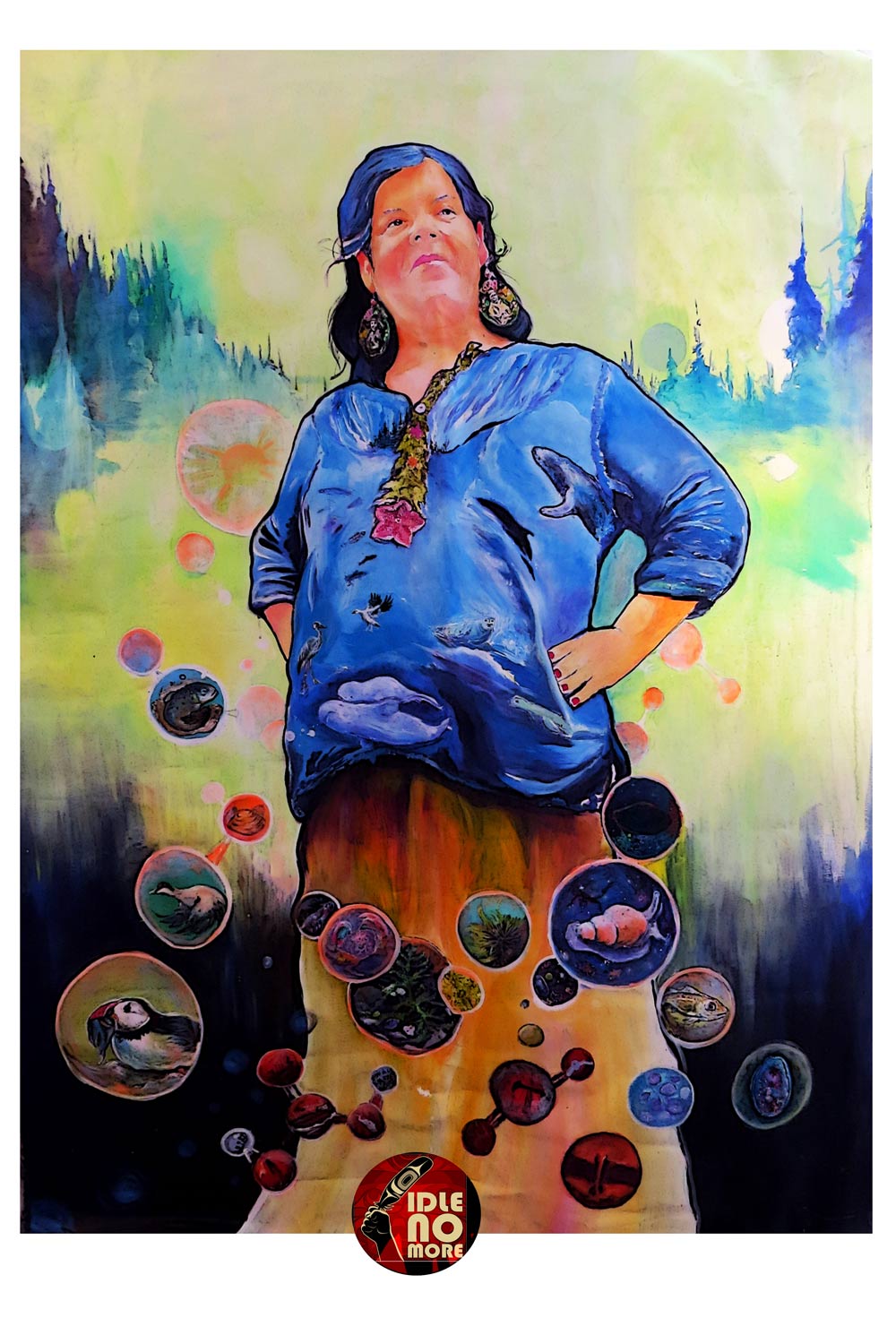 Melissa Mollen Dupuis is an Innu woman, mother, leader, cultural ambassador, and co-organizer of the Idle No More movement in the area known today as Quebec. Water protection is a sacred responsibility of all women. Being pregnant shows the continuity of the stewardship of this sacred river (Shipu — “river” in Innu) that connects us from our mothers to daughters. It is also the living heritage, proof, and memory of water being the beginning of humanity, highlighting our responsibility to protect it to ensure it flows freely for the next seven generations.