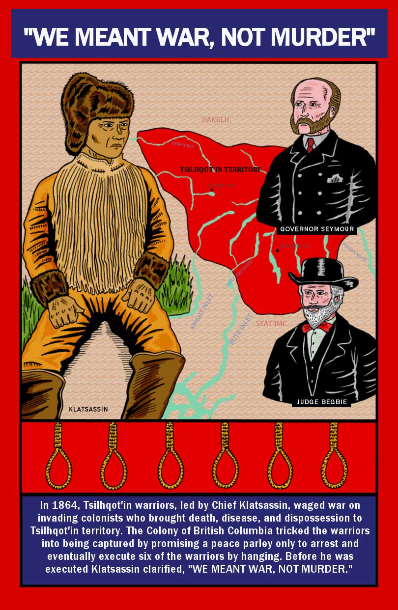 In 1864, Tsilhqot’in warriors, led by Chief Klatsassin, waged war on invading colonists who brought death, disease, and dispossession to Tsilhqot’in territory. The Colony of British Columbia tricked the warriors into being captured by promising a peace parley only to arrest and eventually execute six of the warriors by hanging. Before he was executed Klatsassin clarified, “We meant war, not murder.”