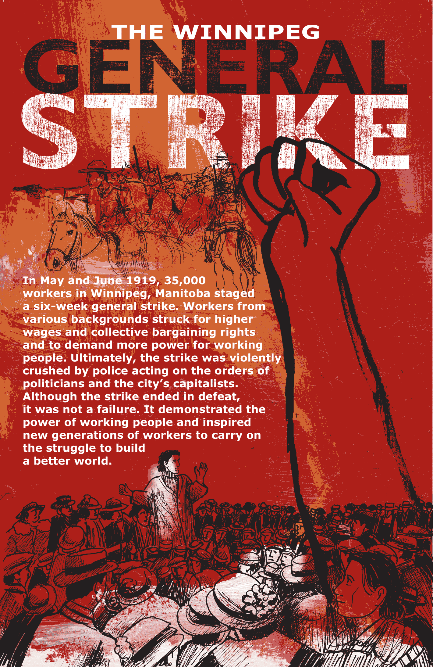In May and June 1919, 35,000 workers in Winnipeg, Manitoba staged a six-week general strike. Workers from various backgrounds struck for higher wages and collective bargaining rights and to demand more power for working people. Ultimately, the strike was violently crushed by police acting on the orders of politicians and the city’s capitalists. Although the strike ended in defeat, it was not a failure. It demonstrated the power of working people and inspired new generations of workers to carry on the struggle to build a better world.