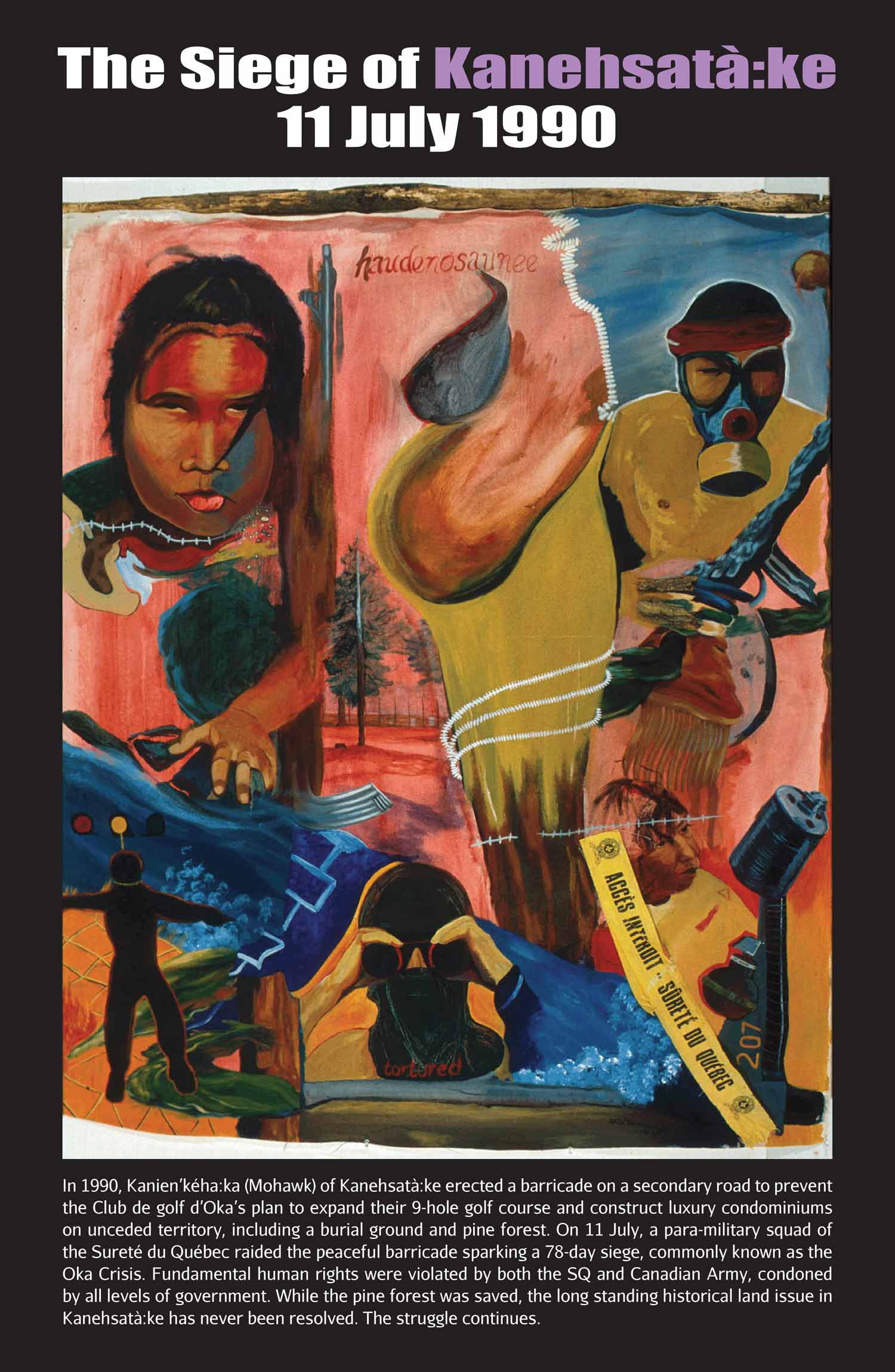 In 1990, Kanien’kéha:ka (Mohawk) of Kanehsatà:ke erected a barricade on a secondary road to prevent the Club de golf d’Oka’s plan to expand their 9-hole golf course and construct luxury condominiums on unceded territory, including a burial ground and pine forest. On 11 July, a para-military squad of the Sureté du Québec raided the peaceful barricade sparking a 78-day siege, commonly known as the Oka Crisis. Fundamental human rights were violated by both the SQ and Canadian Army, condoned by all levels of government. While the pine forest was saved, the long standing historical land issue in Kanehsatà:ke has never been resolved. The struggle continues.
